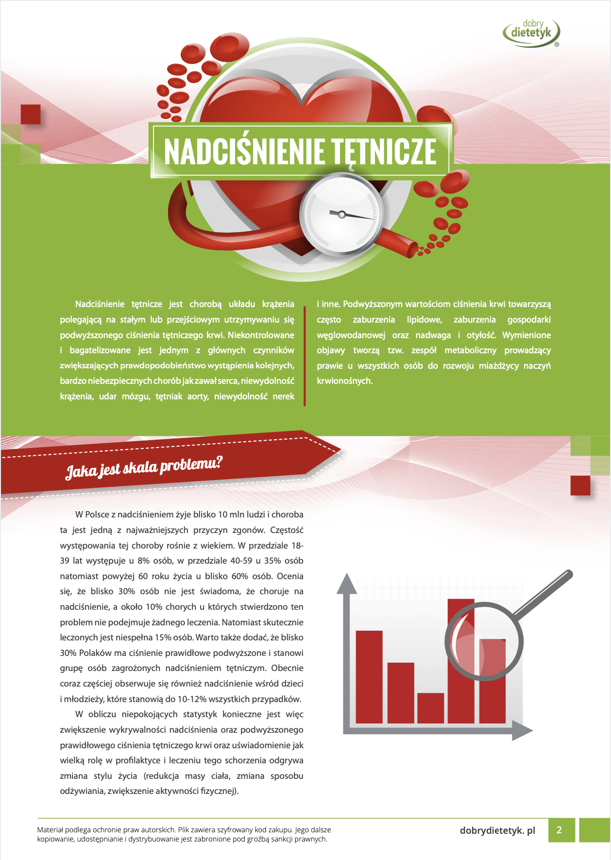 Kompleksowy program żywieniowy dla MĘŻCZYZNzmagających się z problemem nadciśnienia tętniczego. Opracowanie zawiera specjalnie przygotowany przewodnik edukacyjny oraz 30-dniowy jadłospiswspomagający redukcję podwyższonego ciśnienia krwi. W diecie zwrócono szczególną uwagę na podaż składników odżywczych wpływających na relaksację i zdrowie naczyń krwionośnych. Obok uwzględnienia ogólnych potrzeb żywieniowych mężczyzn, zadbano m.in. o podaż odpowiedniej ilości sodu potasu, zachowanie odpowiednich proporcji między tymi składnikami a także dostarczenie zwiększonej ilości kwasów omega-3, które wpływają na procesy rozkurczowe naczyń krwionośnych. W przygotowanej diecie zwrócono także uwagę na ograniczenie podaży składników o działaniu miażdżycorodnym a także zwiększono podaż witamin chroniących naczynia krwionośne przed uszkodzeniem. Dieta sprawdzi się także idealnie w programach redukcji wagi u mężczyzn, w chorobach układu krążenia a także jako dieta po zawale.