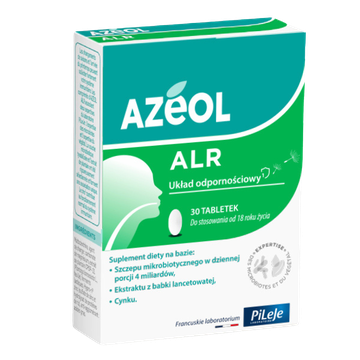Suplement diety na bazie tyndalizowanego szczepu mikrobiotycznego Latilactobacillus sakei LA907 w dziennej porcji 4 miliardów w tabletce, ekstraktu z babki lancetowatej i cynku. Zmieniające się pory roku mogą znacznie obciążyć układ odpornościowy. Tabletki Azeol ALR łączą w sobie dwa obszary specjalistycznej wiedzy laboratorium PiLeJe: wiedzę na temat mikrobioty i wiedzę na temat roślin. Tyndalizowany szczep mikrobiotyczny i ekstrakt z babki lancetowatej zostały rygorystycznie wyselekcjonowane i tworzą wyjątkowe połączenie. Cynk przyczynia się do prawidłowego funkcjonowania układu odpornościowego. Przeciwwskazania: niewskazany u kobiet w ciąży lub karmiących oraz dzieci. Nie przekraczać zalecanej porcji do spożycia w ciągu dnia.