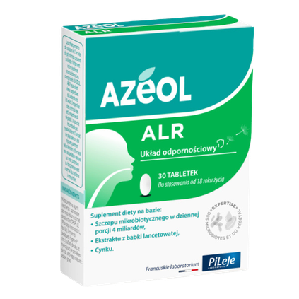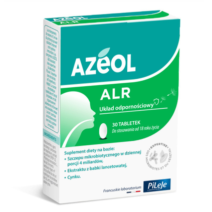 Suplement diety na bazie tyndalizowanego szczepu mikrobiotycznego Latilactobacillus sakei LA907 w dziennej porcji 4 miliardów w tabletce, ekstraktu z babki lancetowatej i cynku. Zmieniające się pory roku mogą znacznie obciążyć układ odpornościowy. Tabletki Azeol ALR łączą w sobie dwa obszary specjalistycznej wiedzy laboratorium PiLeJe: wiedzę na temat mikrobioty i wiedzę na temat roślin. Tyndalizowany szczep mikrobiotyczny i ekstrakt z babki lancetowatej zostały rygorystycznie wyselekcjonowane i tworzą wyjątkowe połączenie. Cynk przyczynia się do prawidłowego funkcjonowania układu odpornościowego. Przeciwwskazania: niewskazany u kobiet w ciąży lub karmiących oraz dzieci. Nie przekraczać zalecanej porcji do spożycia w ciągu dnia.