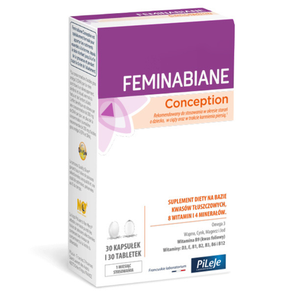 Feminabiane Conception jest specjalnie opracowanym suplementem diety dostarczającym składniki odżywcze niezbędne dla organizmu kobiety w okresie starań o dziecko, w trakcie ciąży aż do zakończenia karmienia dziecka piersią. Suplement diety na bazie kwasów tłuszczowych Omega 3, 8 witamin oraz 4 minerałów.